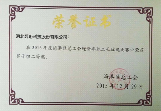2015年12月29日上午,在海港區(qū)總工會舉辦的迎新年職工長跳繩比賽中,羿珩職工發(fā)揮團隊精神,在參賽的200名各單位職工團體中,經(jīng)過數(shù)輪比拼、一路過關(guān)斬將,最終榮獲男子組二等獎。