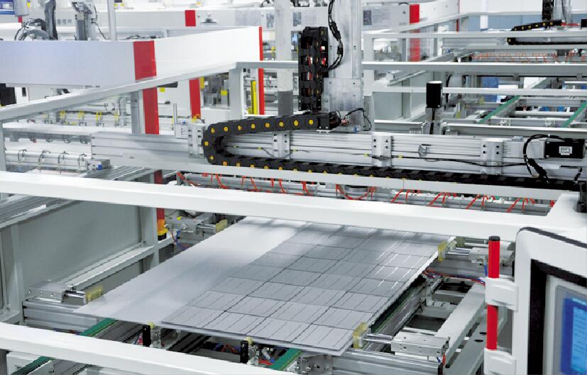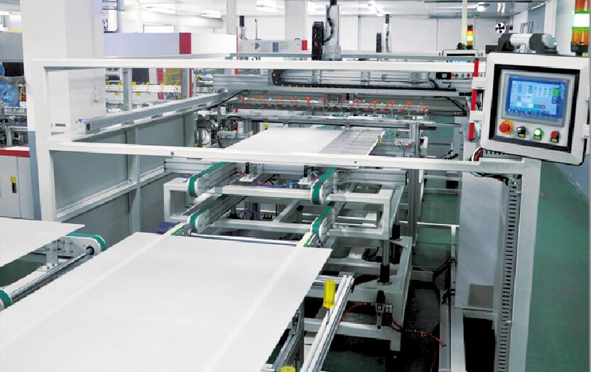 此設備用于將自動串焊機串焊好的電池串,按照工藝尺寸要求和排版方向順序自動排版鋪設到玻璃/EVA上,組成電池串陣列。玻璃/EVA通過傳輸線傳輸至指定位置,并進行機械定位,四軸機械手抓取電池串實現(xiàn)智能相機檢測缺陷、定位、自動旋轉、自動排版功能。設備通過同步帶傳輸與自動生產線對接,實現(xiàn)了自動流水作業(yè)。