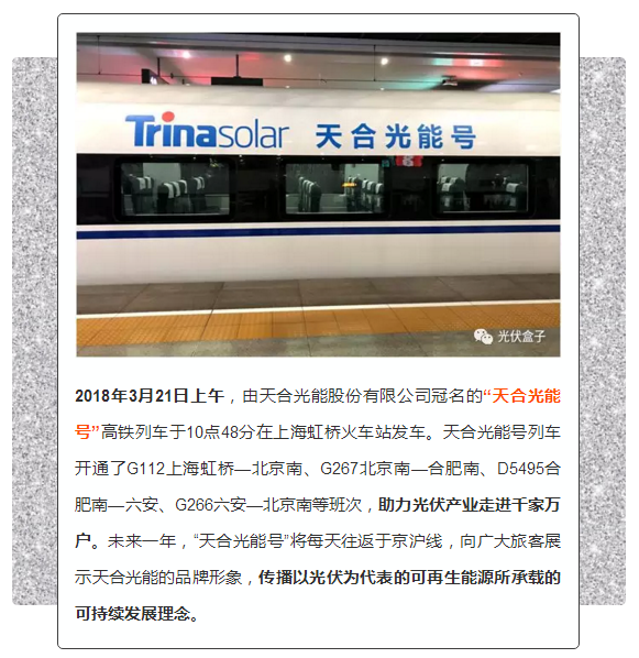 2018年3月21日上午,由天合光能股份有限公司冠名的“天合光能號(hào)”高鐵列車于10點(diǎn)48分在上海虹橋火車站發(fā)車。天合光能號(hào)列車開通了G112上海虹橋—北京南、G267北京南—合肥南、D5495合肥南—六安、G266六安—北京南等班次,助力光伏產(chǎn)業(yè)走進(jìn)千家萬戶。未來一年,“天合光能號(hào)”將每天往返于京滬線,向廣大旅客展示天合光能的品牌形象,傳播以光伏為代表的可再生能源所承載的可持續(xù)發(fā)展理念。