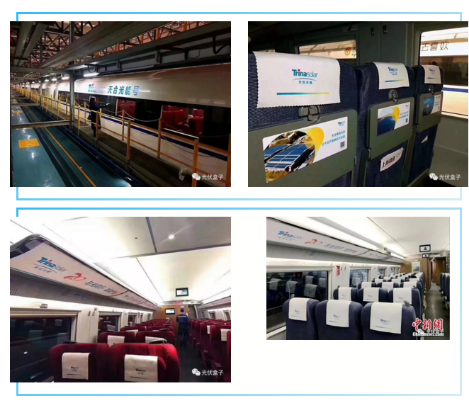 “天合光能號(hào)”的車身、內(nèi)外車門、行李架、頭巾和小桌板等位置均印有天合光能企業(yè)標(biāo)識(shí)和“與光同行,‘誠(chéng)’就夢(mèng)想”的口號(hào)。