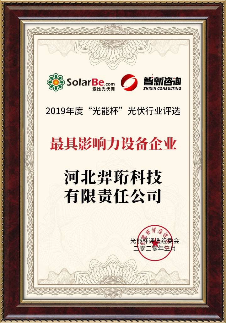 河北羿珩科技實力斬獲2019年“光能杯”光伏行業(yè)評選“最具影響力設備企業(yè)”大獎